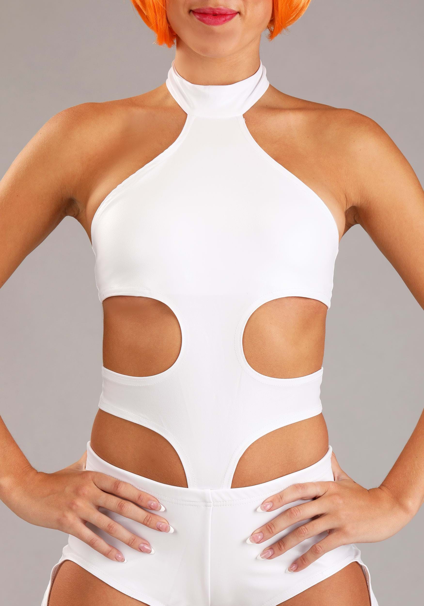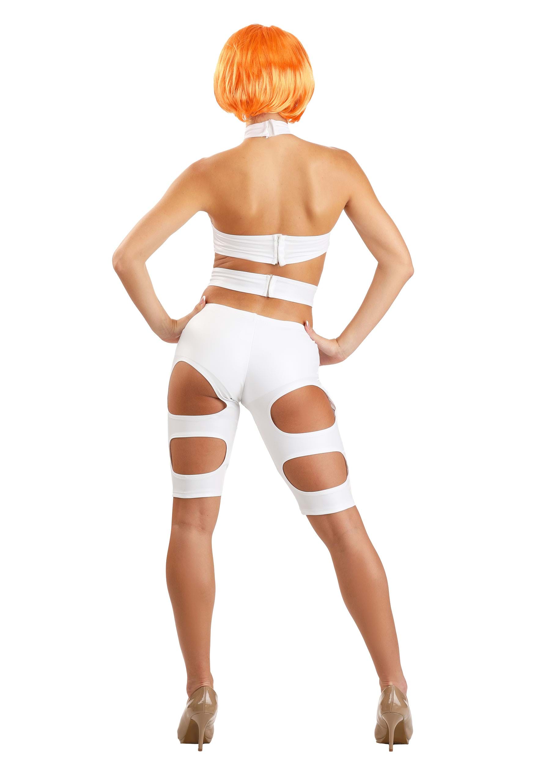 Come help and become humanity’s greatest and most glorious hope in this 5th Element Leeloo Thermal Bandages costume.  Unite the four elements to conjure forth the one being who is destined to save us:  Leeloo Dallas Multipass!  … Well, close enough, anyway.  Don this shining white jumpsuit with hook-and-eye closures at the choker and two upper body straps and burst your way into the scene once your cellular regeneration is complete.  You will look especially futuristic in the jumpsuit alone, but join the look with a vivid, neon orange wig and you’ll be ready to dismiss the Darkness and save humanity from an eternal destruction and look amazing while doing so!
