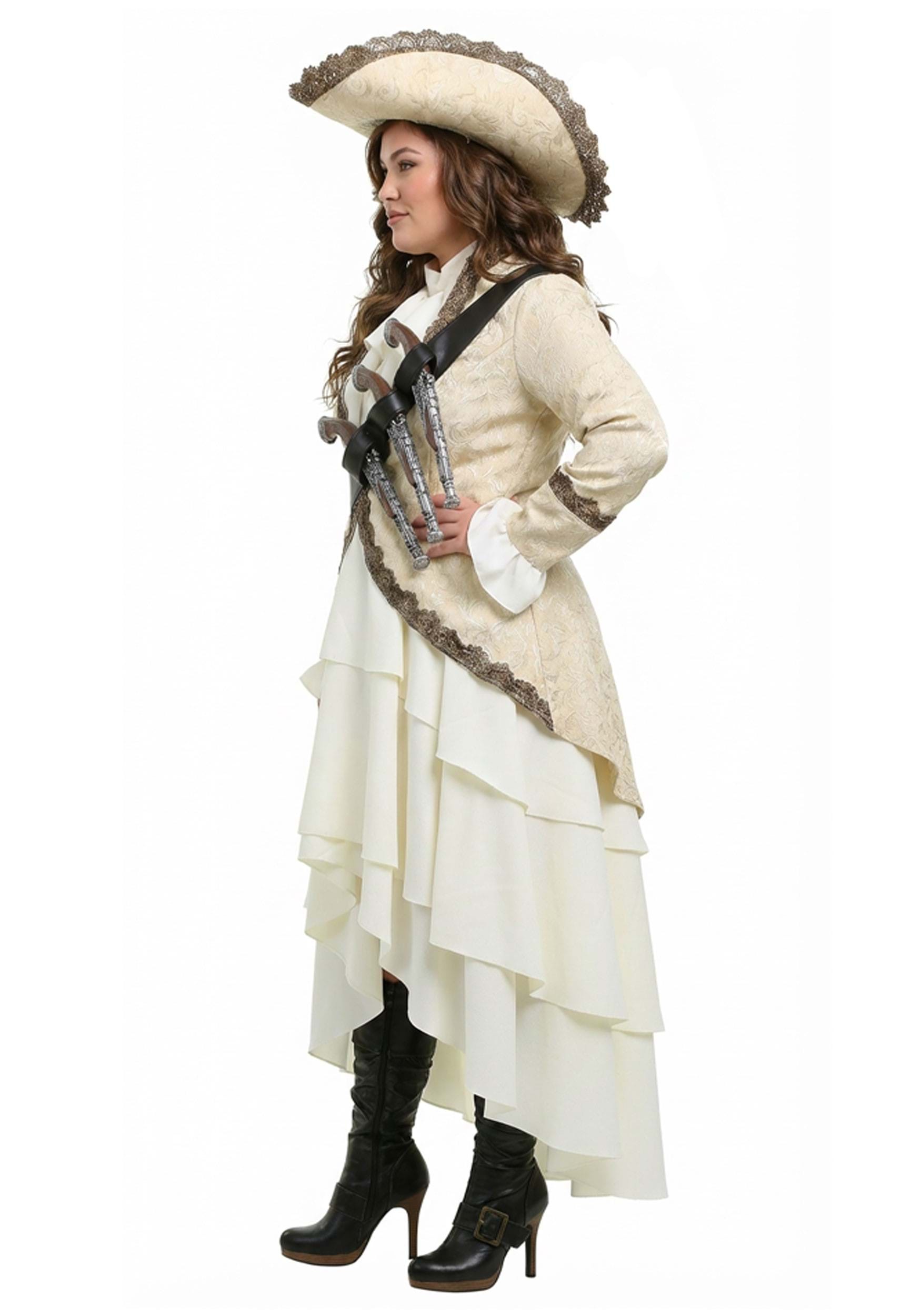 In this outfit, you’ll have a look of the highest level of sophistication of 17th century pirate fashion. The tailcoat jacket has lace-edged cuffs and lapels, while the tiered skirt has an asymmetric hemline. Also included is a petticoat with multiple tiers of tulle for extra volume. For ultimate authority, this costume comes with a faux leather sash with 3 loops on which to hold your pistols (accessories sold separately). Finally, to finish the look, the hat has wire in its lace-edged brim for customized shape. Don't leave the neckscarf on dry land!