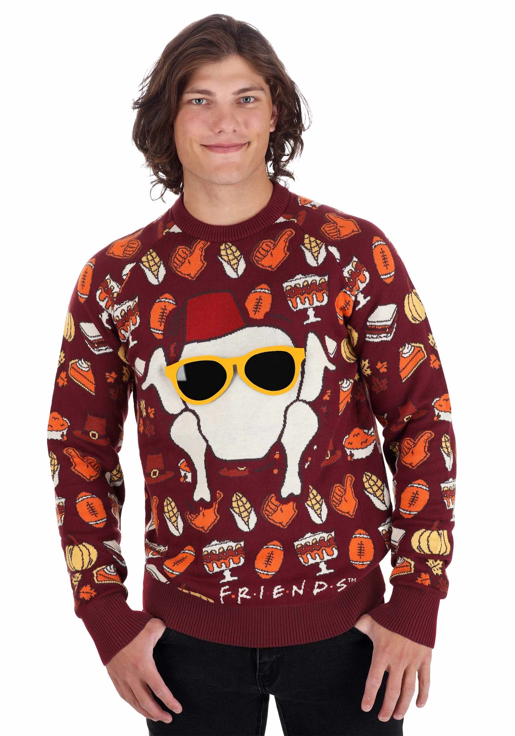 Instead, the charming scene is recreated as a cozy fall-colored cotton-blend knit sweater with all-over graphics of familiar Friends jokes, like Rachel's trifle and Ross's Thanksgiving sandwich. Then in the center front, a large illustrated turkey wearing a fez shines with a pair of detachable yellow-plastic sunglasses making the garment a surefire way to make fans smile and conversation flow!