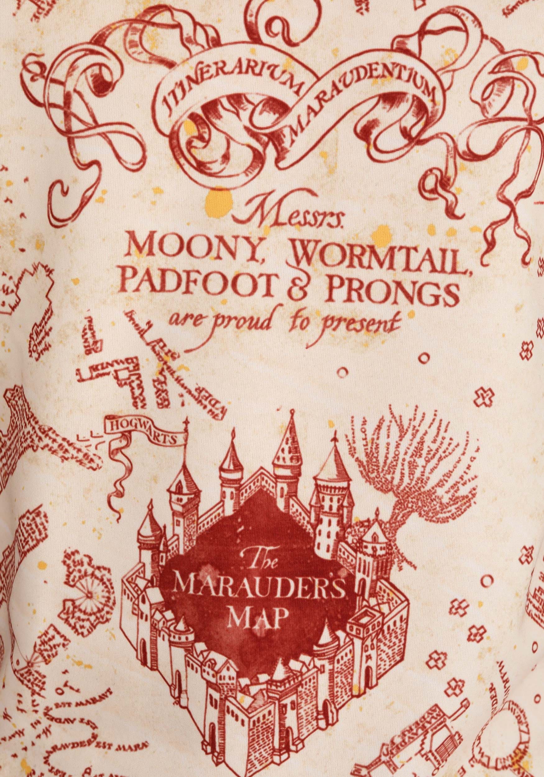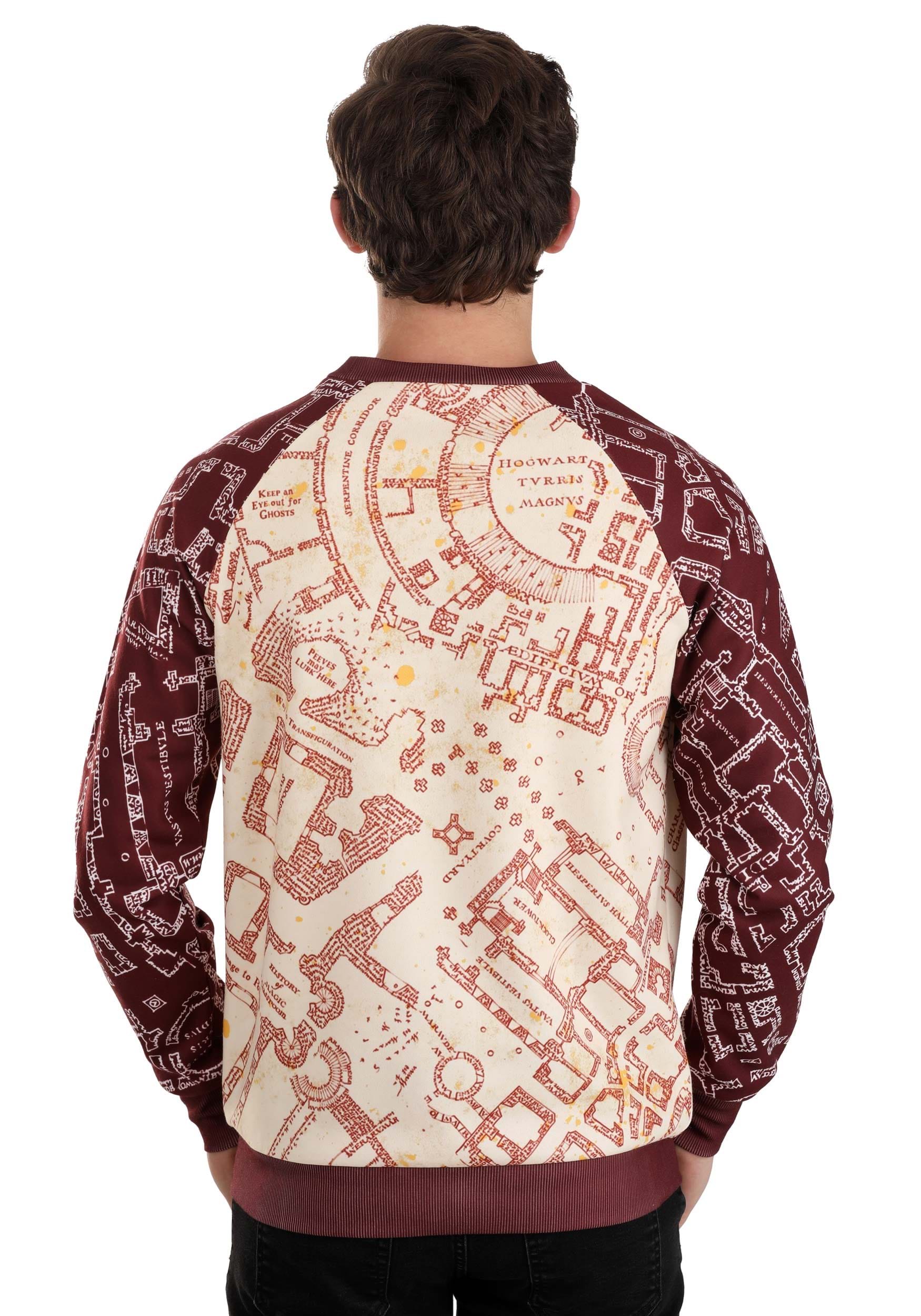 Confidently and cozily, tour Hogwarts in this exclusive Harry Potter Maurader’s Map Sweatshirt! This Made By Us pullover features a sublimated print of the legendary map that got Harry and his friends out of several sticky situations. Making your wanderings even safer, there are no named dots strolling the printed hallways so that you can read the layout of the castle without confusion. Though, you may prefer to simply walk your neighborhood, favorite shopping mall, or impress at your office holiday party in the two-toned sweater. Officially licensed and fit for adult sizes XS to 3X, this is a must-have garment for every Hogwarts alum and muggle!