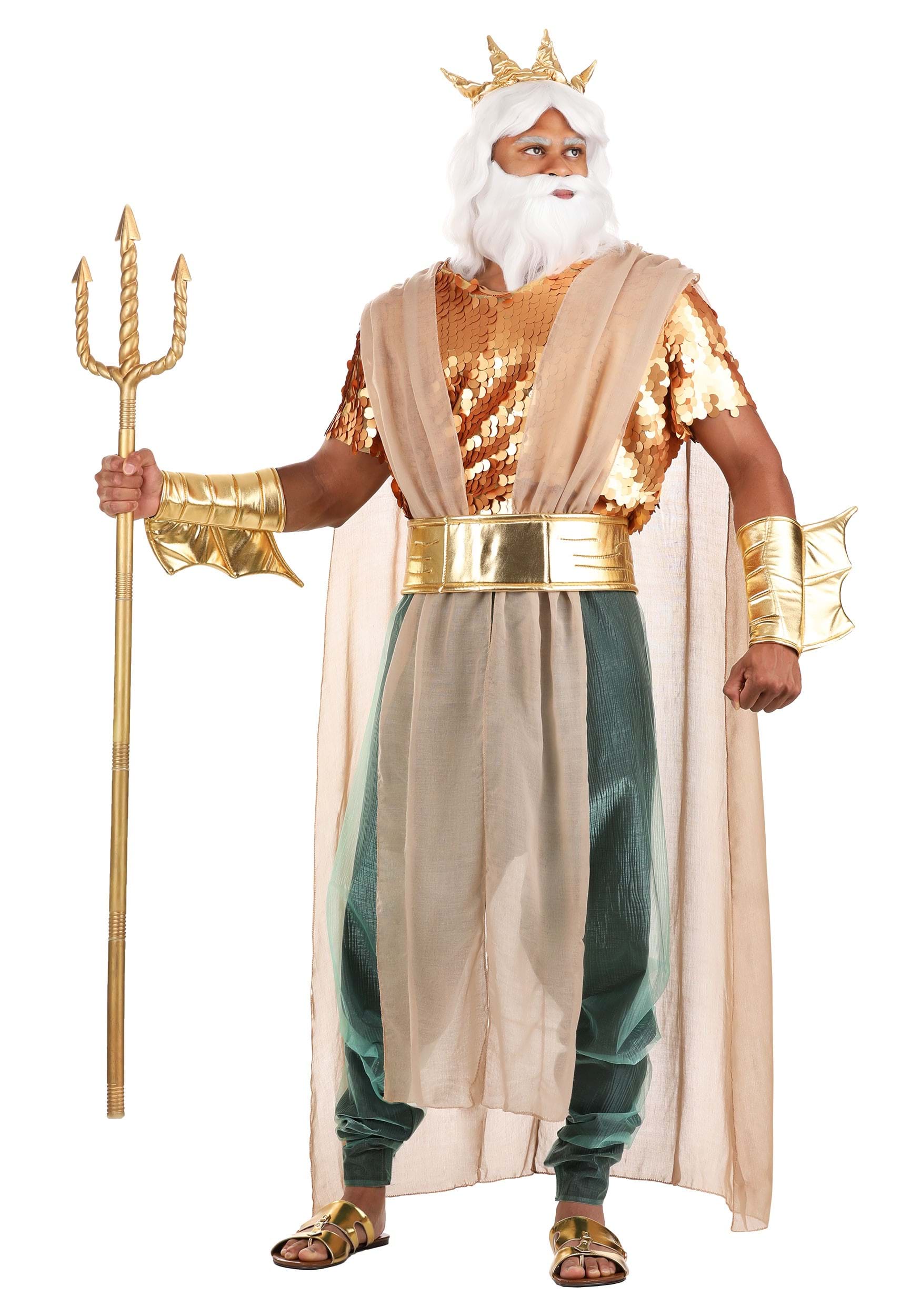 Now, before we start throwing divine implements out to anyone, we've got to make sure you look the part. Start off with this Poseidon Men's Costume and we'll see how you rank. This short-sleeved pullover tunic is fully lined for comfort. The shirt is covered in mesh with bronze sequins to give you that fresh-from-the-sea look. The elastic pants have a godly billowing effect thanks to the organza overlay while the long ivory cape assures the noble stature of an oceanic deity. Finish off the look with a golden belt and the golden coral crown and you might just find the waters ebbing to your decree!
