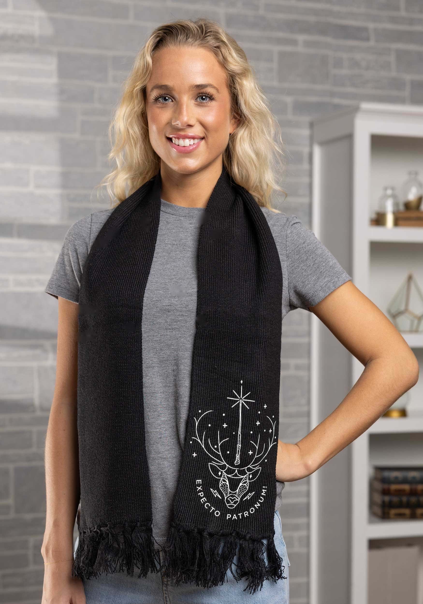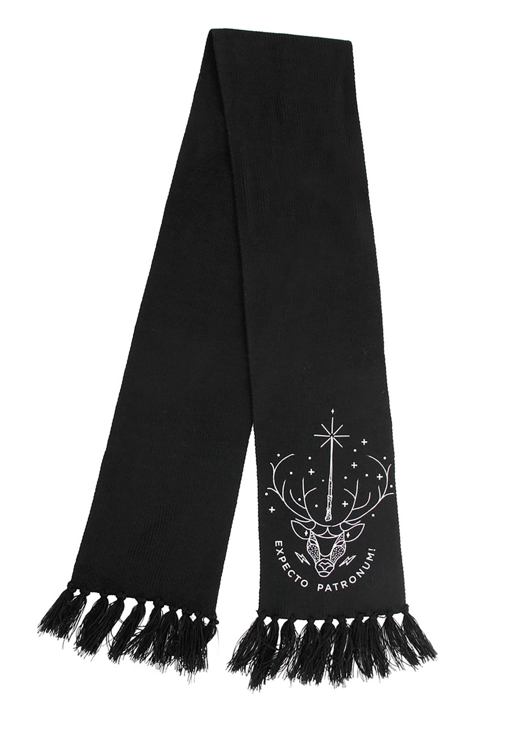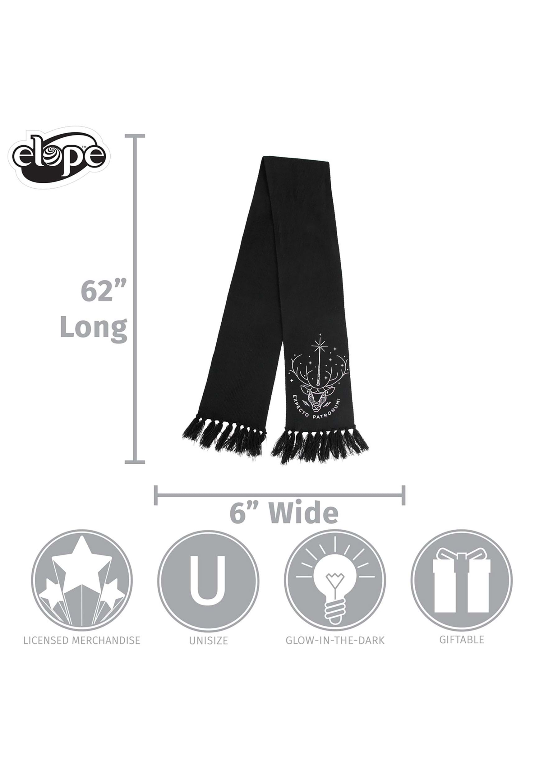Accessorize your look and show love to the prettiest spell in the Wizarding World with this Patronus Glow Knit Scarf. It's made from classy knit yarn (90% acrylic and 10% polyester, for warmth and washability) in solid black. The ends are tasseled for some flair. The details are printed graphics and sequined for some silver glitter and glow reminiscent of the night sky. A stag's head stands out against the sparkling night sky, with "Expecto Patronum" curving underneath in matching letters. This scarf goes with every outfit, whether you're dressed as a muggle or in wizarding robes.