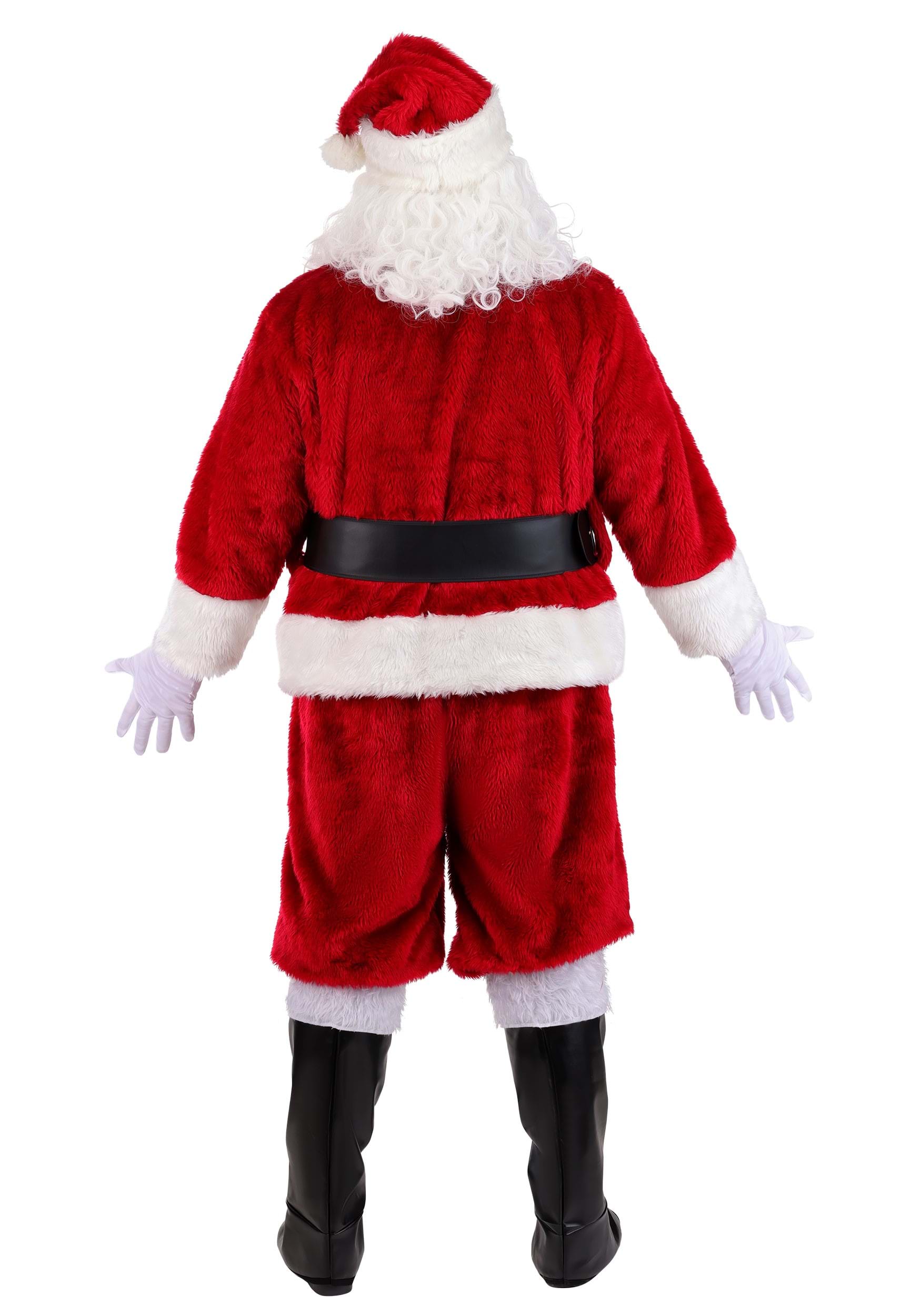 This costume includes everything you need to channel pure Kris Kringle energy: a rich red jacket with luxurious white faux fur trim, matching pants, a classic Santa hat with that signature pom-pom, a wide black belt with a gold-tone buckle, and faux leather boot tops that easily slip over your own shoes. The whole look is soft, cozy, and generously sized for comfort (and, you know, the belly that shakes like a bowl full of jelly).