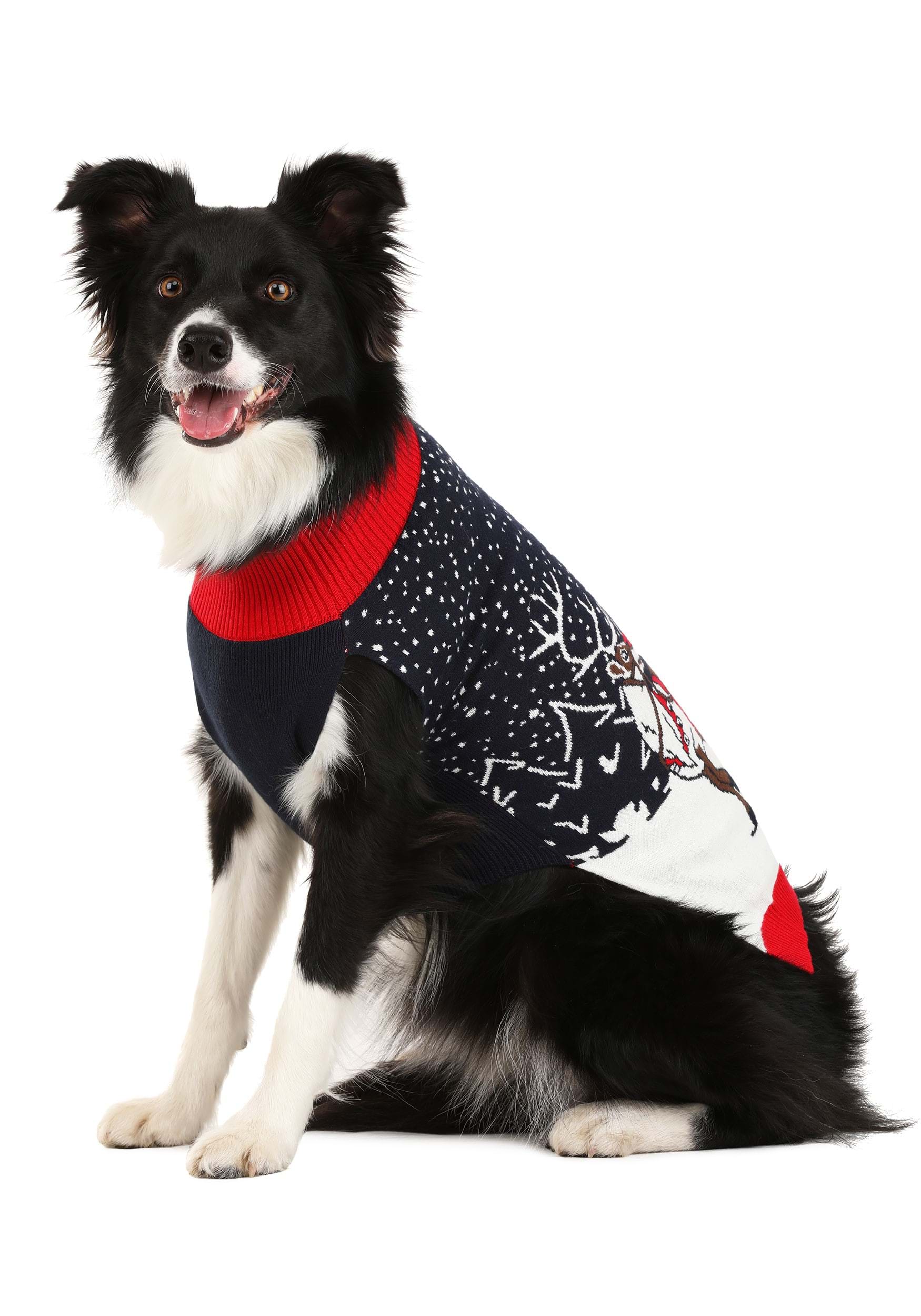 Let your pet participate in the Santa Watch by wearing this exclusive Santa and Reindeer Sweater for Dogs! The pullover sweater features a thick red rib knit neckband and waistband. The back is printed with an image of St. Nicholas with his trusty reindeer.