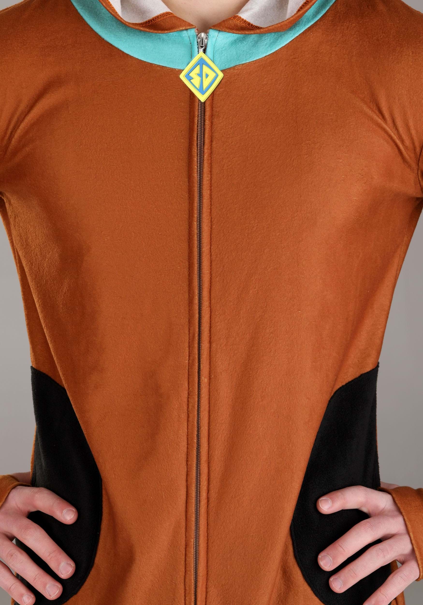 With a simple zip, you can become one of cartoon history's greatest dogs of all time! This simple union suit has a zipper in the front and is made out of cozy brown fleece fabric that recreates Scooby's color from the Hannah Barbera seres. It even has his trademark black spots! The hood has Scooby's face designed into it and uses embroidered details to get a realistic look. The top of the hood features a pair of floppy dog ears and the bottom of the hood features his signature blue collar. Of course, you can't be your favorite pooch without a tail! The back of the suit comes with an attached tail to bring the whole look together! Once you have it on, you'll be ready to join Shaggy and the rest of the gang for an after-mystery chill session in the Mystery Machine!
