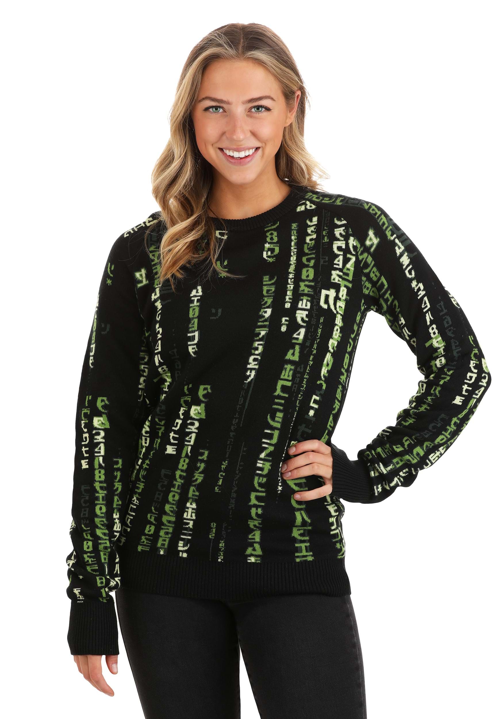 This The Matrix Ugly Sweater is Warner Brothers officially licensed, designed and brought to life by our own team of apparel designers! It features an acrylic/cotton blend with the characters of the Matrix code appearing in contrasting shades of green to create the famous fading effect of the falling rain code. It features a unisex fit, just be sure to check out our size chart before you order to determine the best fit for men and women.