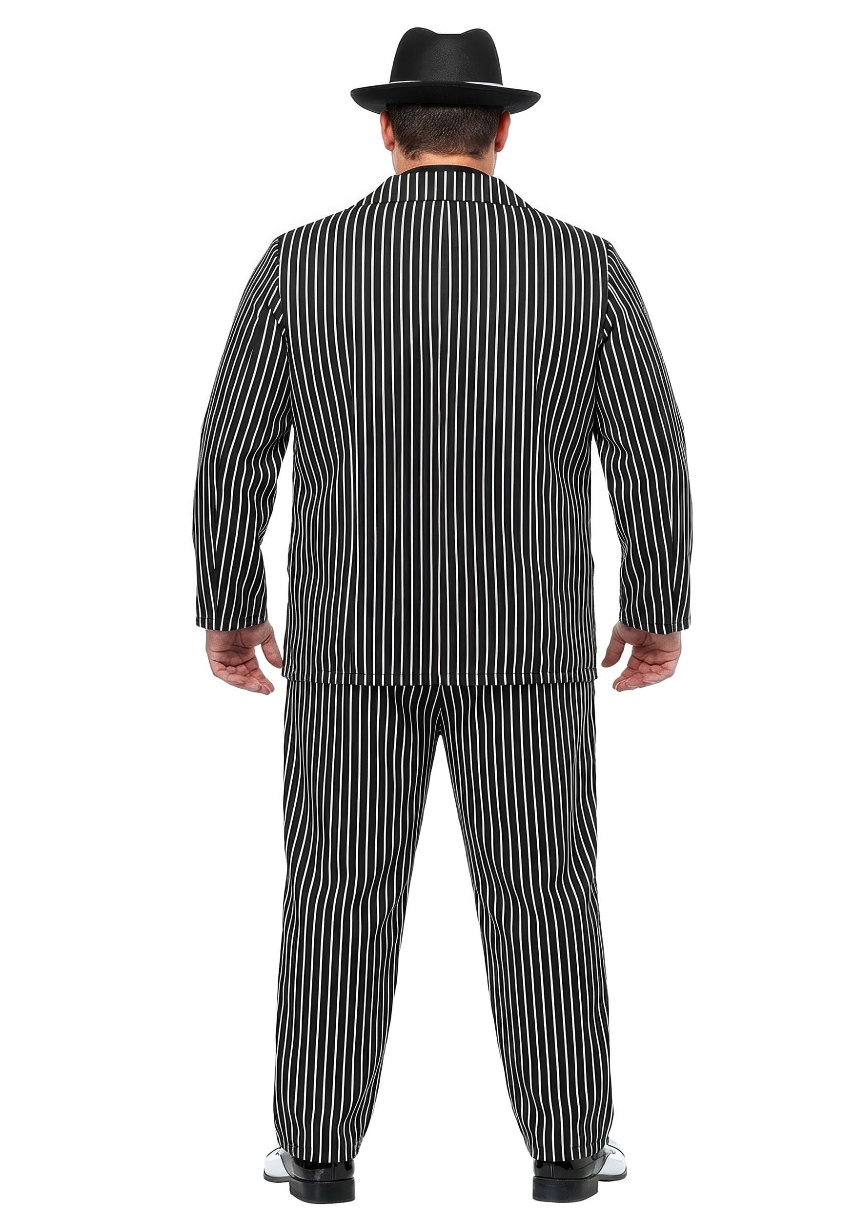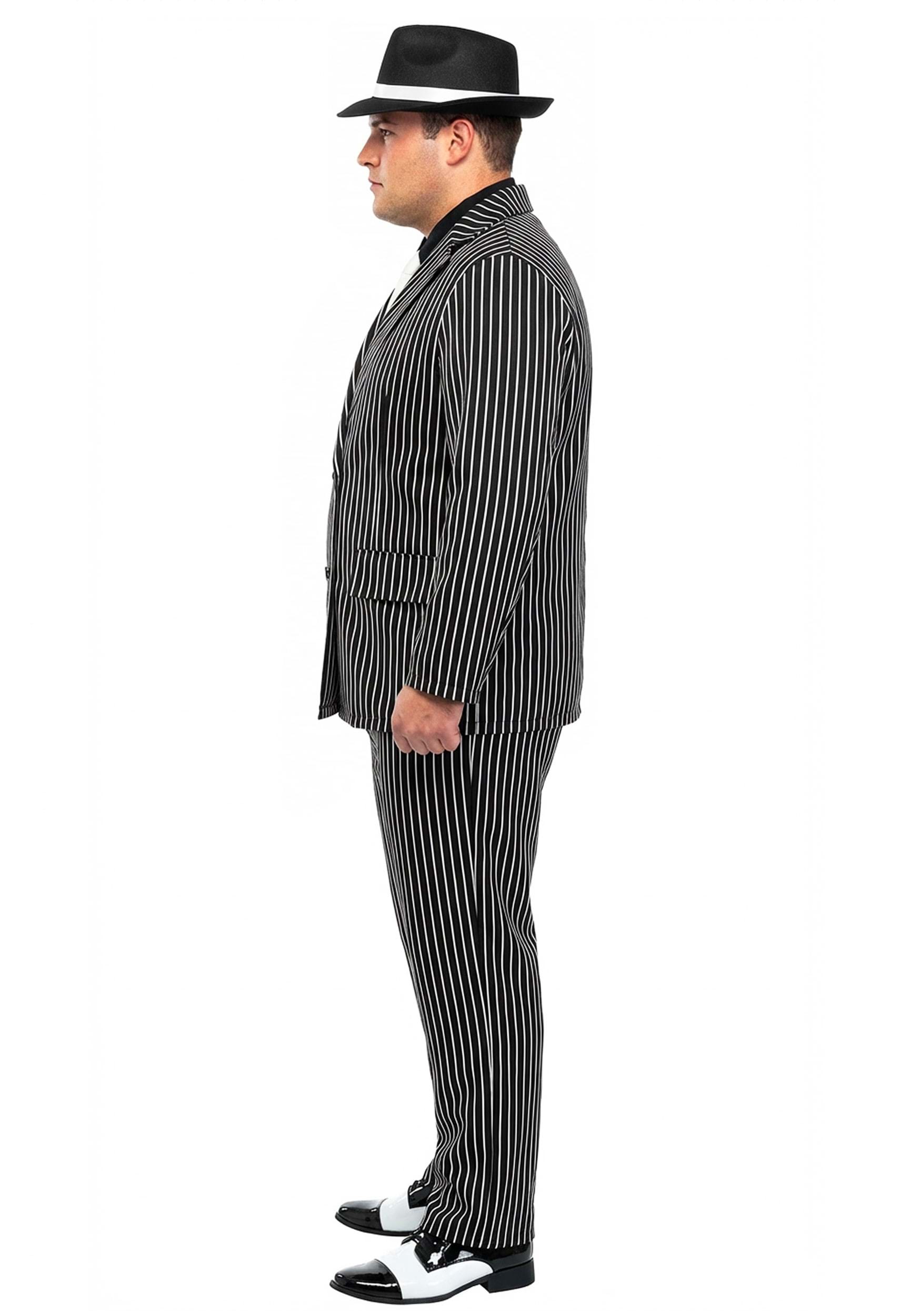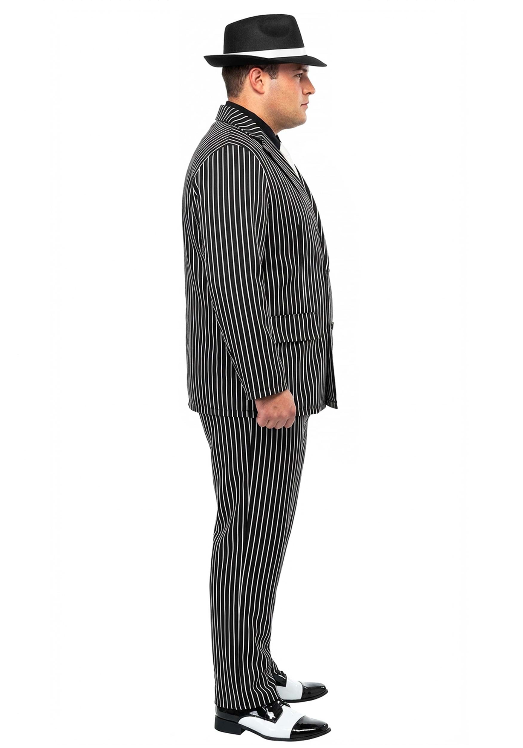 That's right bub. You wanna be in charge, well then you better look in charge. Something like our Wide Stripe Plus Size Gangster Suit should do the trick. This poplin and broadcloth suit has a black jacket and pants with wide white pinstripes. The jacket is double-breasted, with pocket flaps, and functional buttons. The shirt has ribbon waist ties and a white necktie sewn on for your convenience. The pants have an elastic waistband which makes changing threads quickly a breeze. Wear something like this and no one will doubt you're the head honcho.