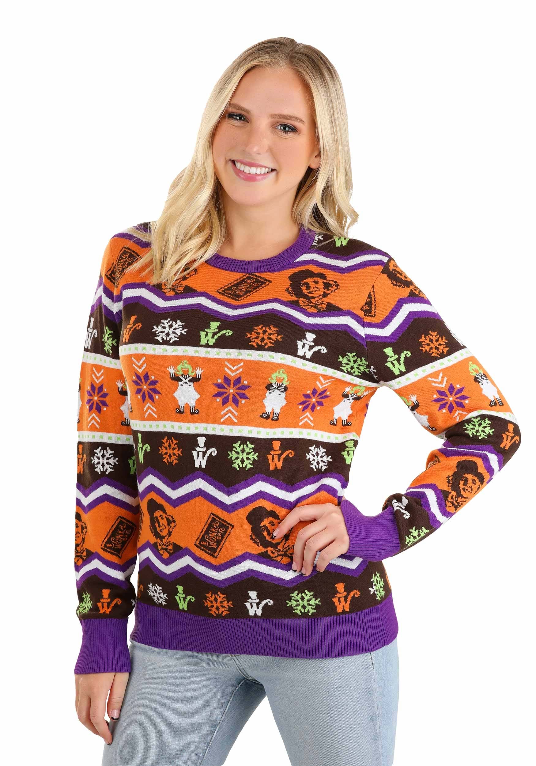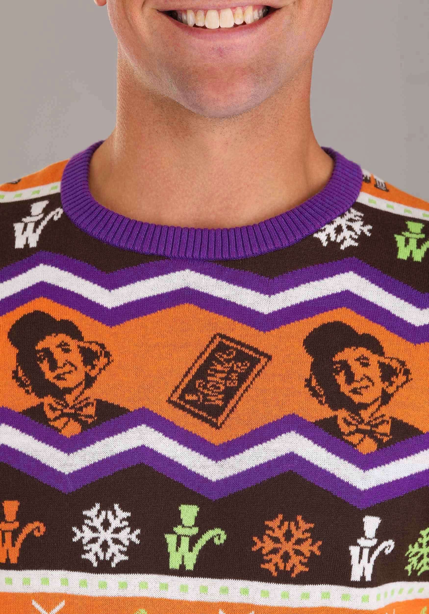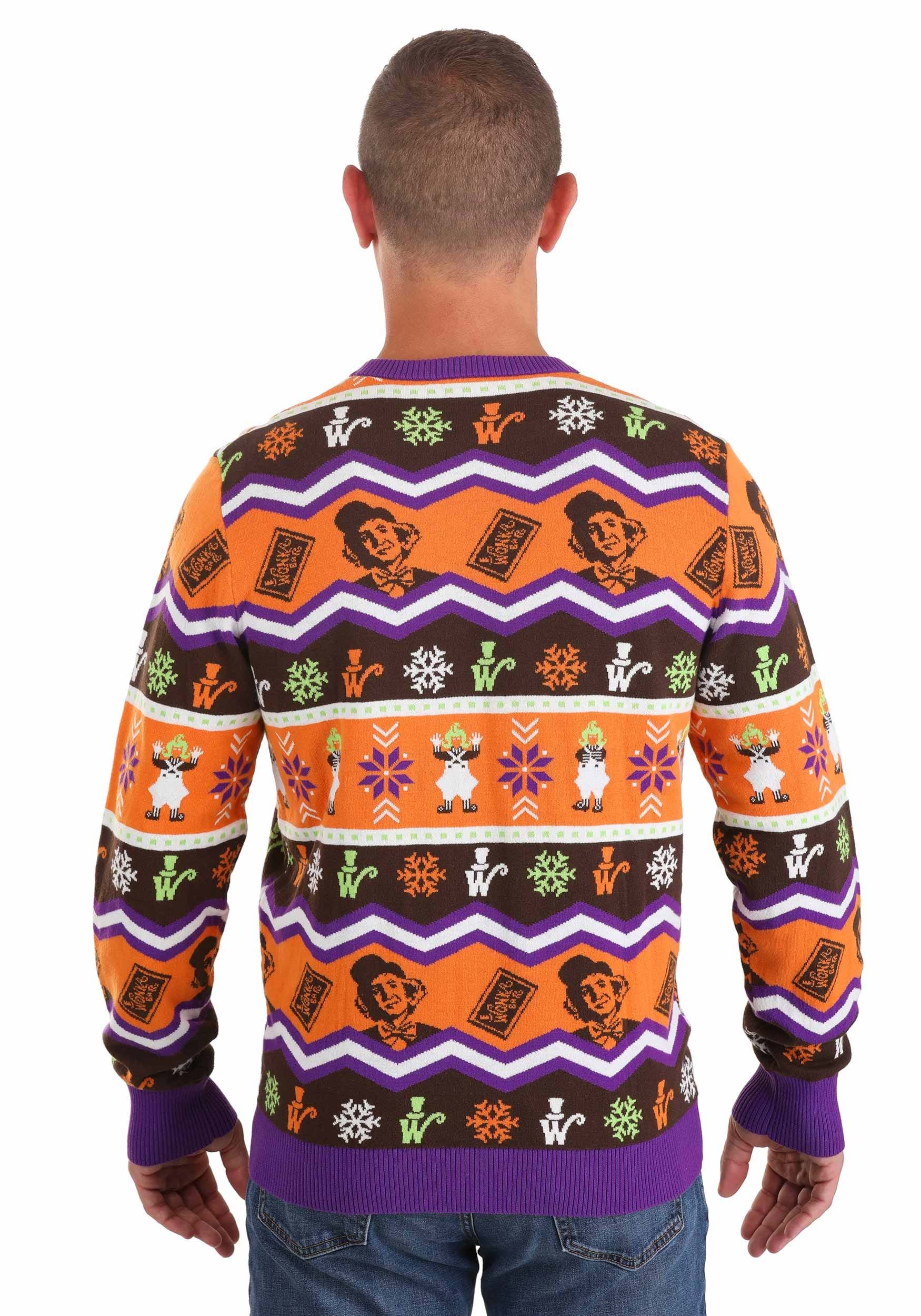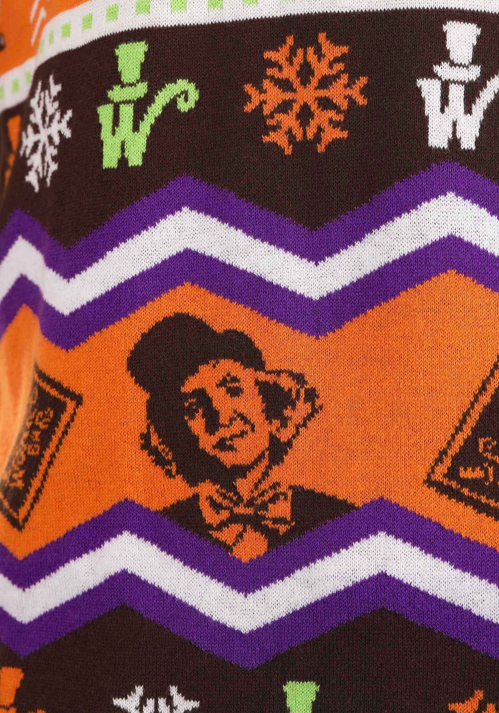 Of course, that meant we finally had to turn all that whacky wonkiness into the perfect Willy Wonka Adult Ugly Sweater! This cotton beauty is a Made By Us treat with an all-over print inspired by Willy Wonka and the Chocolate Factory. Need some Oompa Loompas of your own? A Wonka Bar to keep things sweet? How about rib-knit cuffs and a comfy purple collar and waistband to keep things feeling fit? You'll have all that and more with this animated sweater. (It might even give you something to distract yourself if you ever end up in that tunnel of terror!)